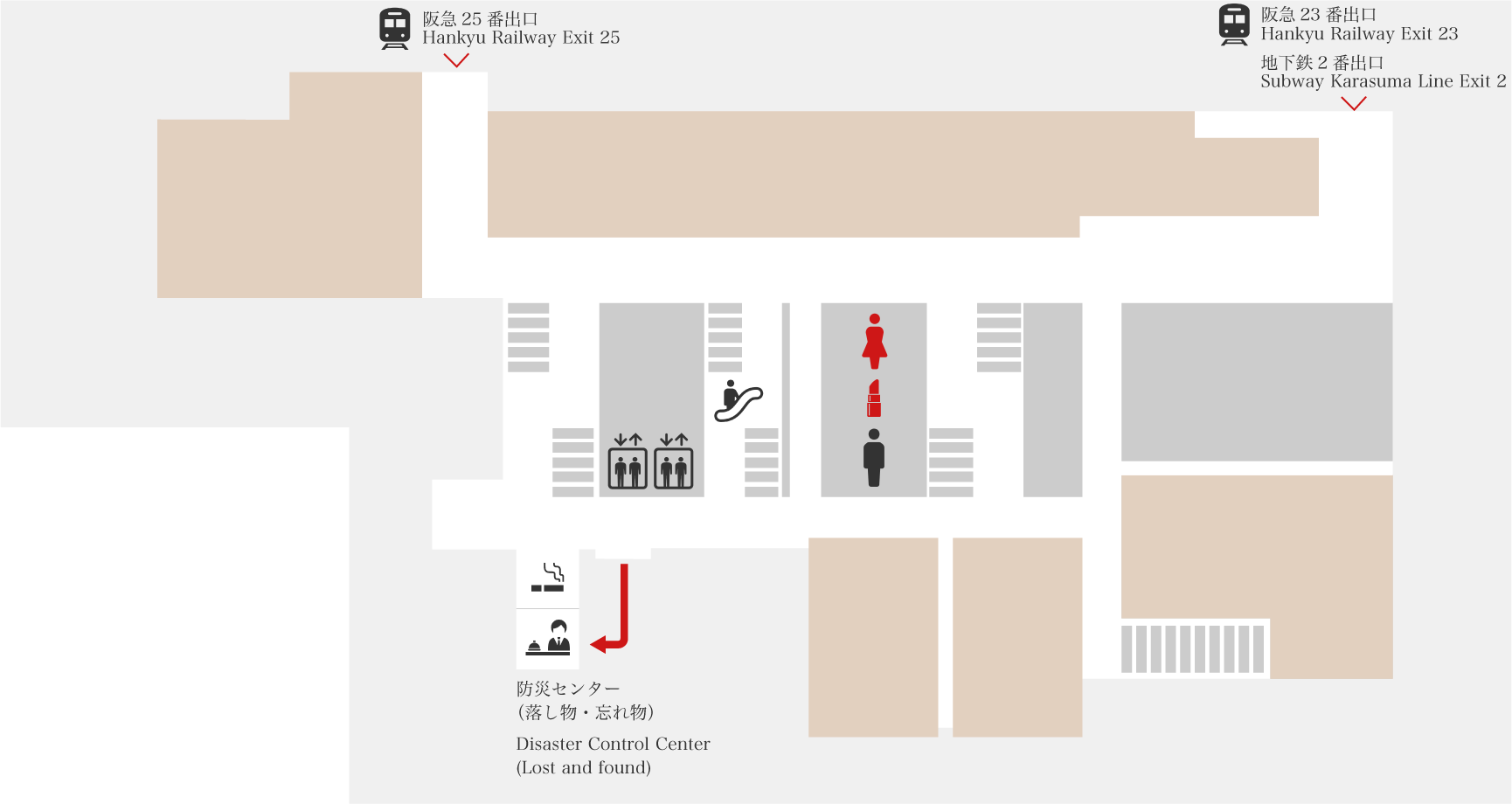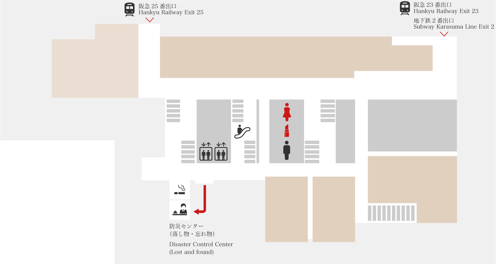 COCON KARASUMAでは車椅子の貸し出しを行っております。ご利用希望の方は防災センターまたはお近くのスタッフにお声をかけてください。