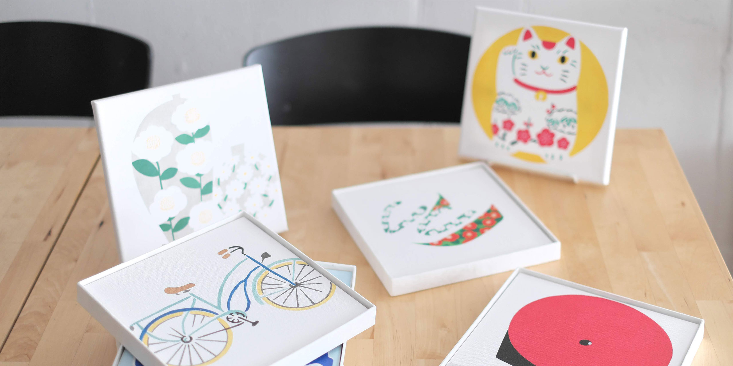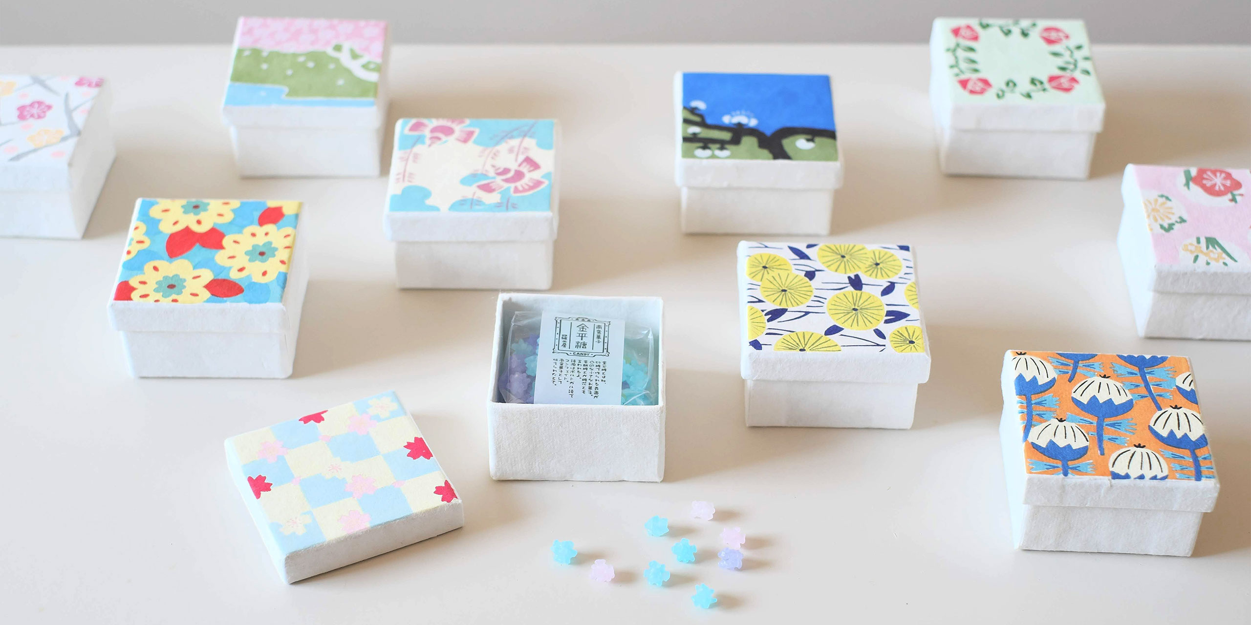 職人がひとつひとつ手しごとで描いた四季の風景や動物たちの物語は、インテリアやギフトアイテムにぬくもりを添えてくれます。オリジナルパッケージに入った金平糖やどら焼きなどの手土産もご用意しています。